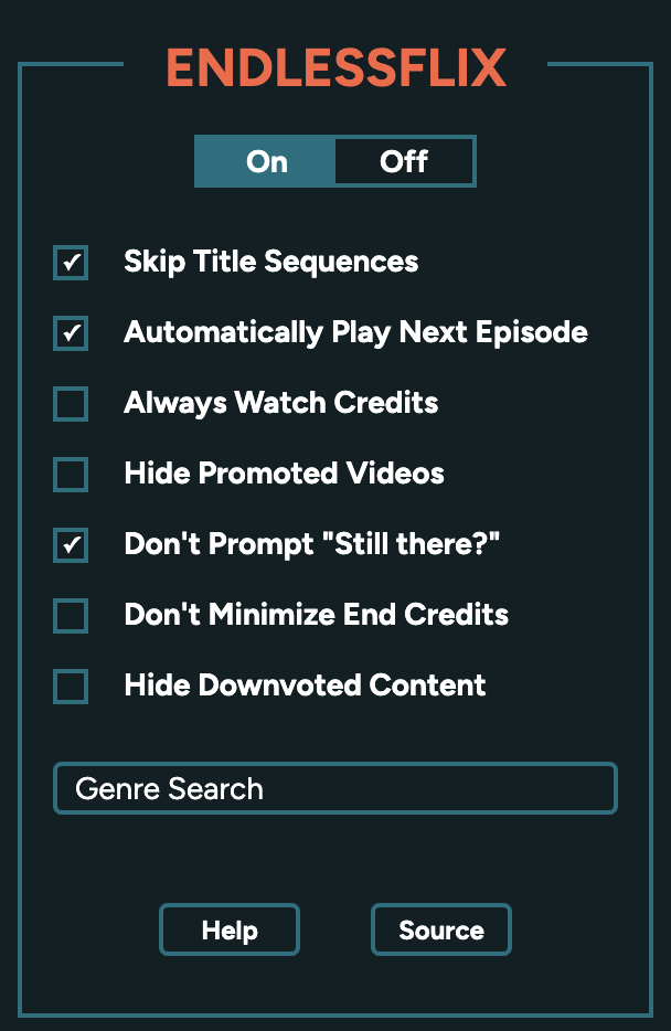 EndlessFlix allows you to customize it's functionality with an options menu, which can be accessed by clicking the logo in the top bar.